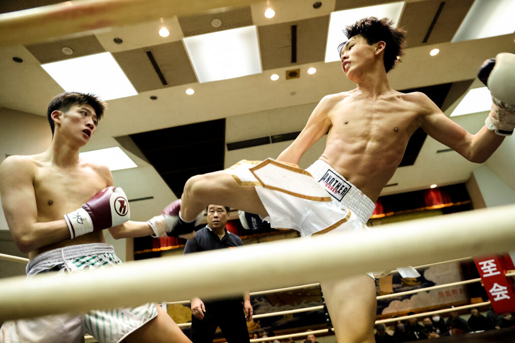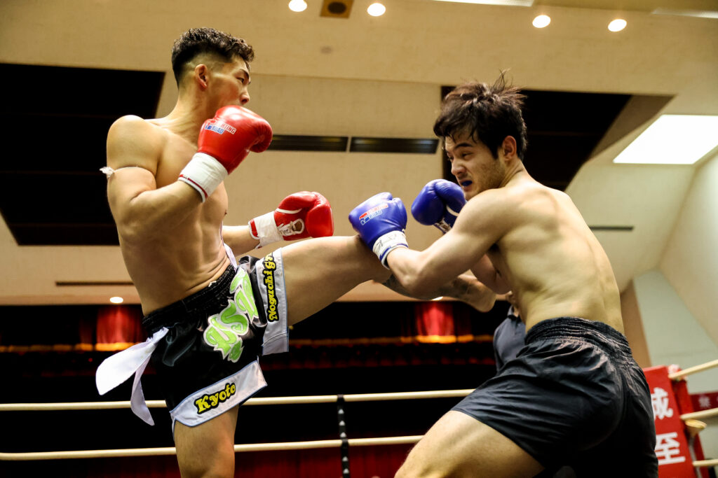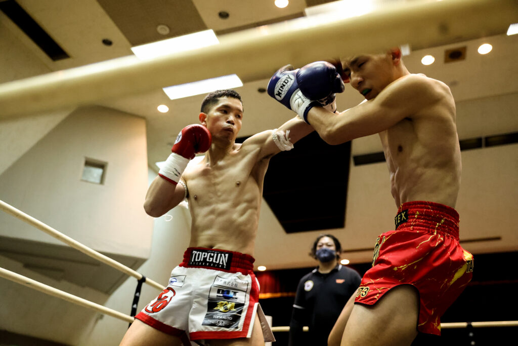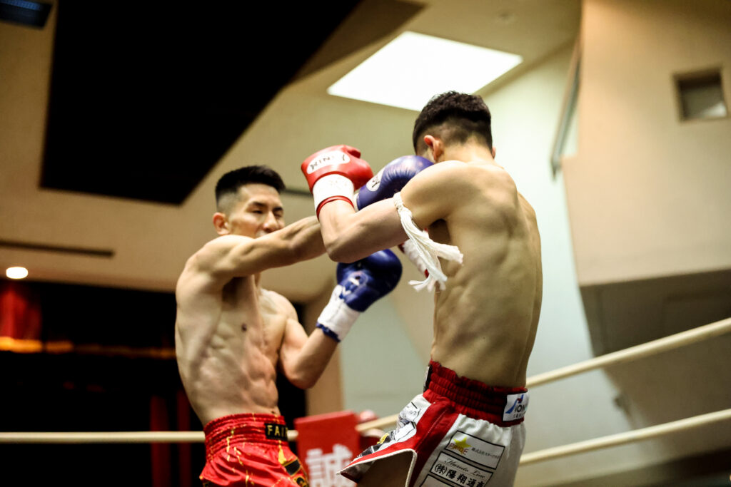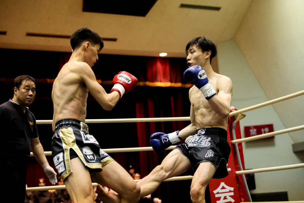2R 越野がボディーストレートや膝をクリーンヒットさせ、滑飛が徐々に攻めづらくなった一瞬を突いたカウンターの右フックが滑飛の顎を捉えダウンを奪う