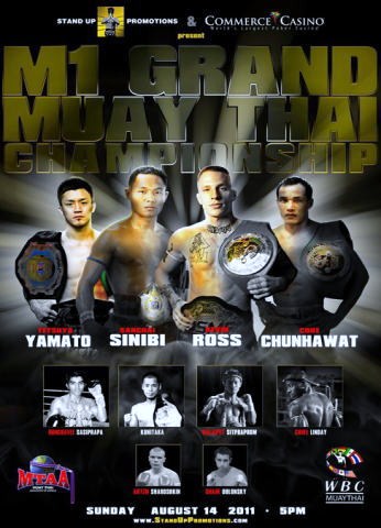 来る08月14日、アメリカ・カリフォルニア州ロサンゼルスのコマース・カジノで開催される【M1 ムエタイ・グランド・チャンピオンシップ】という興行にWMCインターナショナルライト級王者&2010 K-1 MAX -63kg日本王者の大和哲也とWBCムエタイ インターナショナル スーパーバンタム級王者の国崇が出場します。