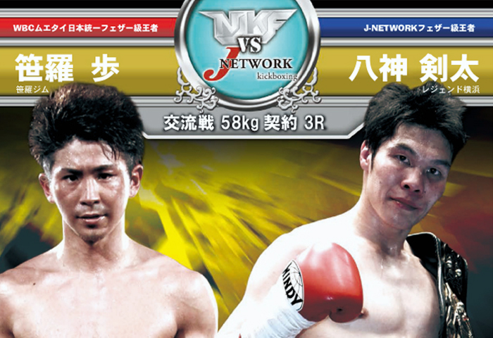 『NJKF 2015 5th』(07月20日、東京・後楽園ホール)では、WBCムエタイ日本統一フェザー級王者・笹羅歩とJ-NETWORK同級王者・八神剣太によるフェザー級王者対決が行われる。特異なノーガードスタイルを持つ八神に、しかしWBCムエタイ・インターナショナル王座を目指す笹羅は『通過点』と意に介さない。夏の王者対決、その行方やいかに。